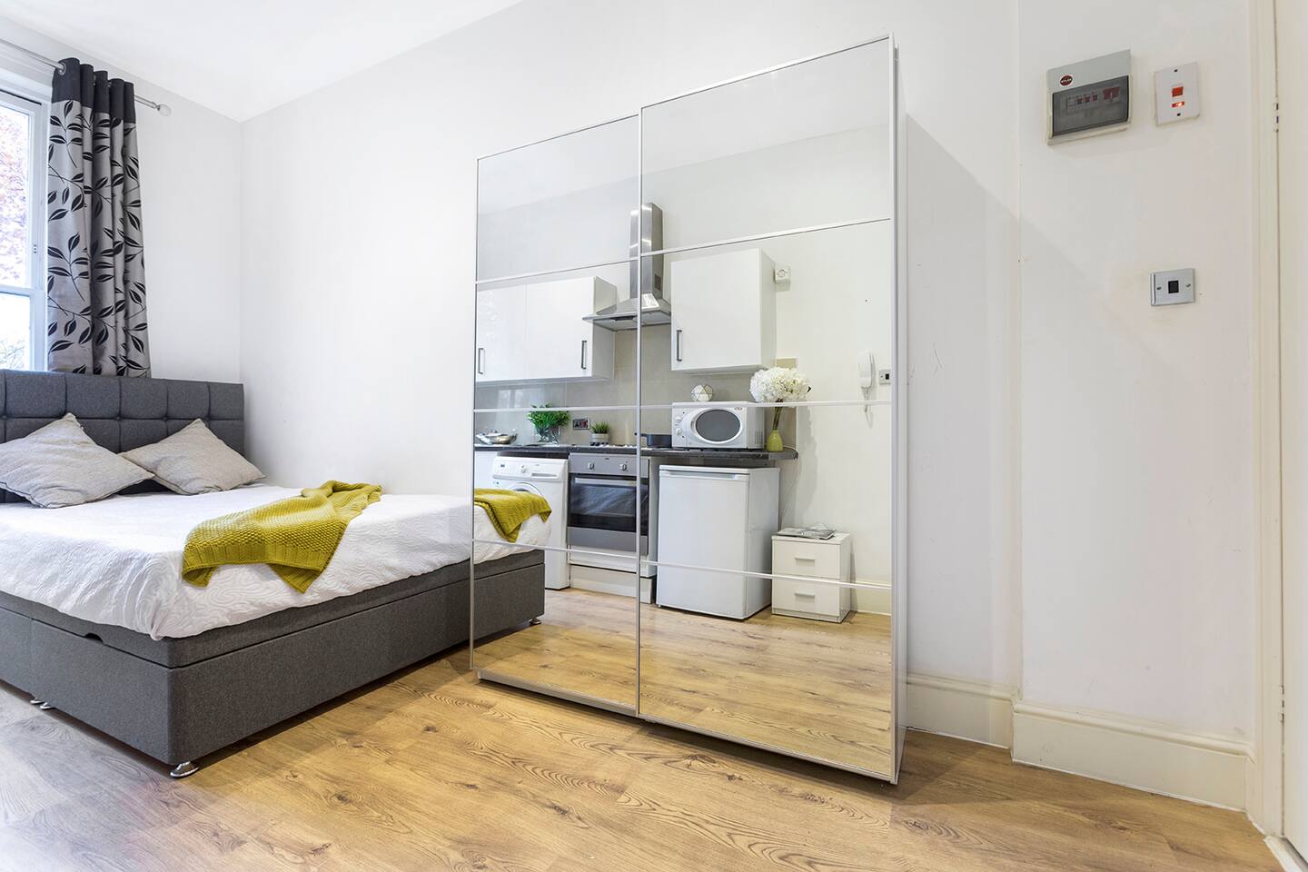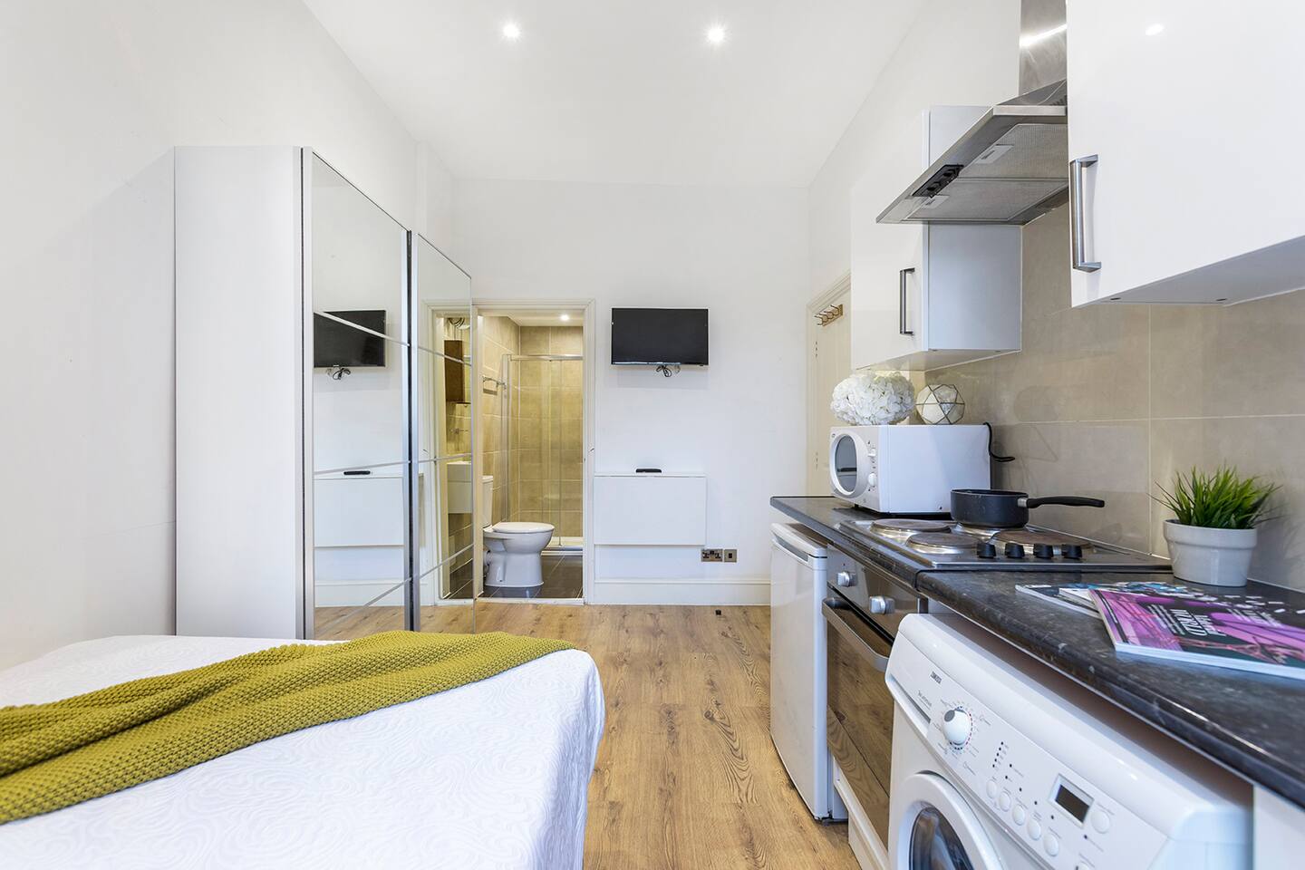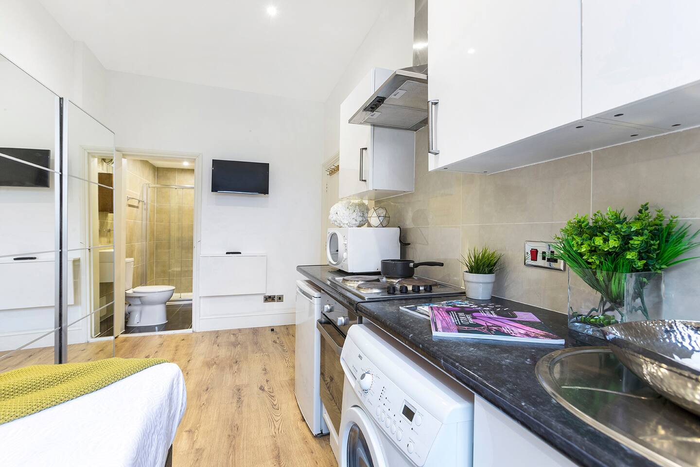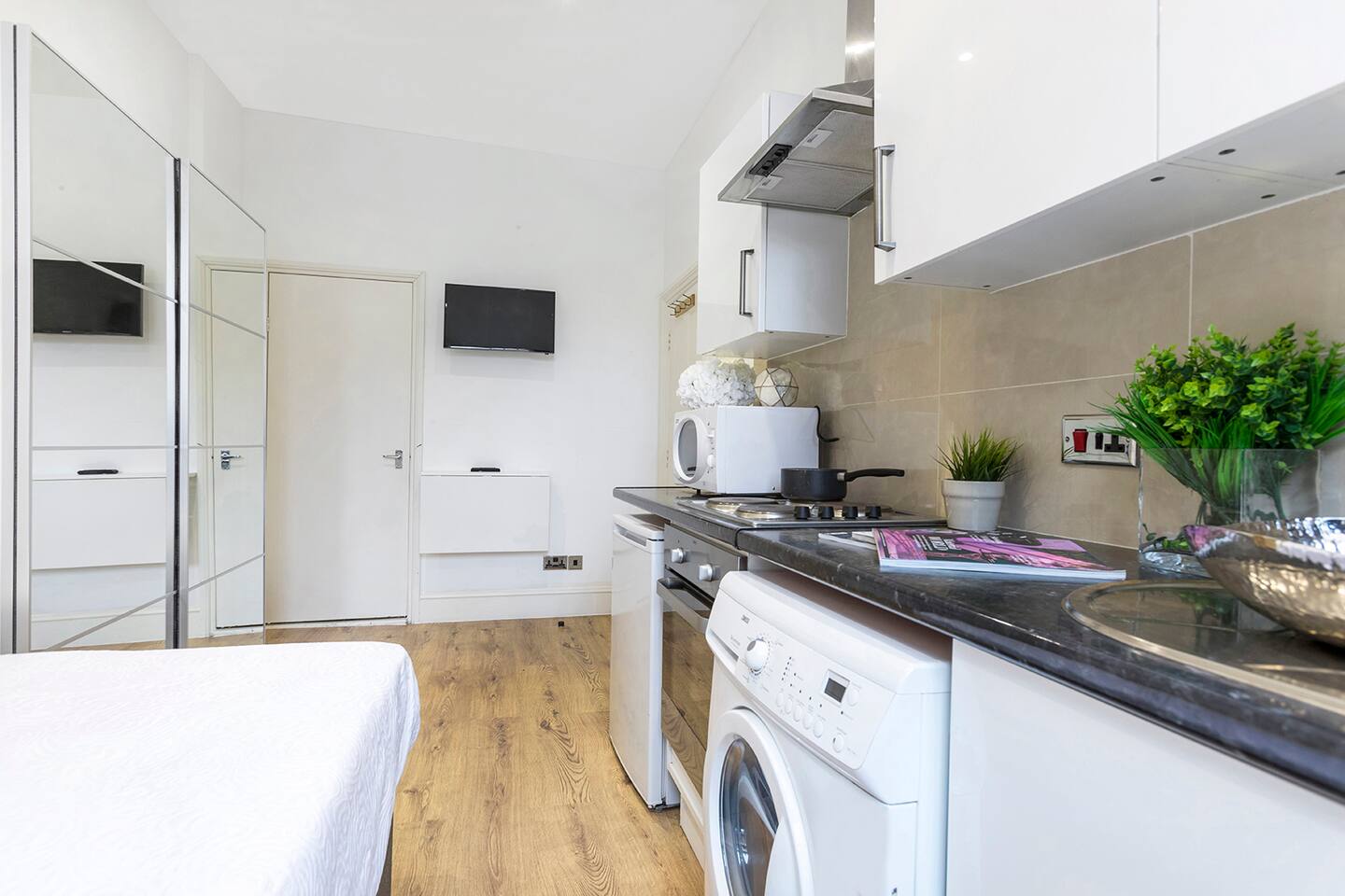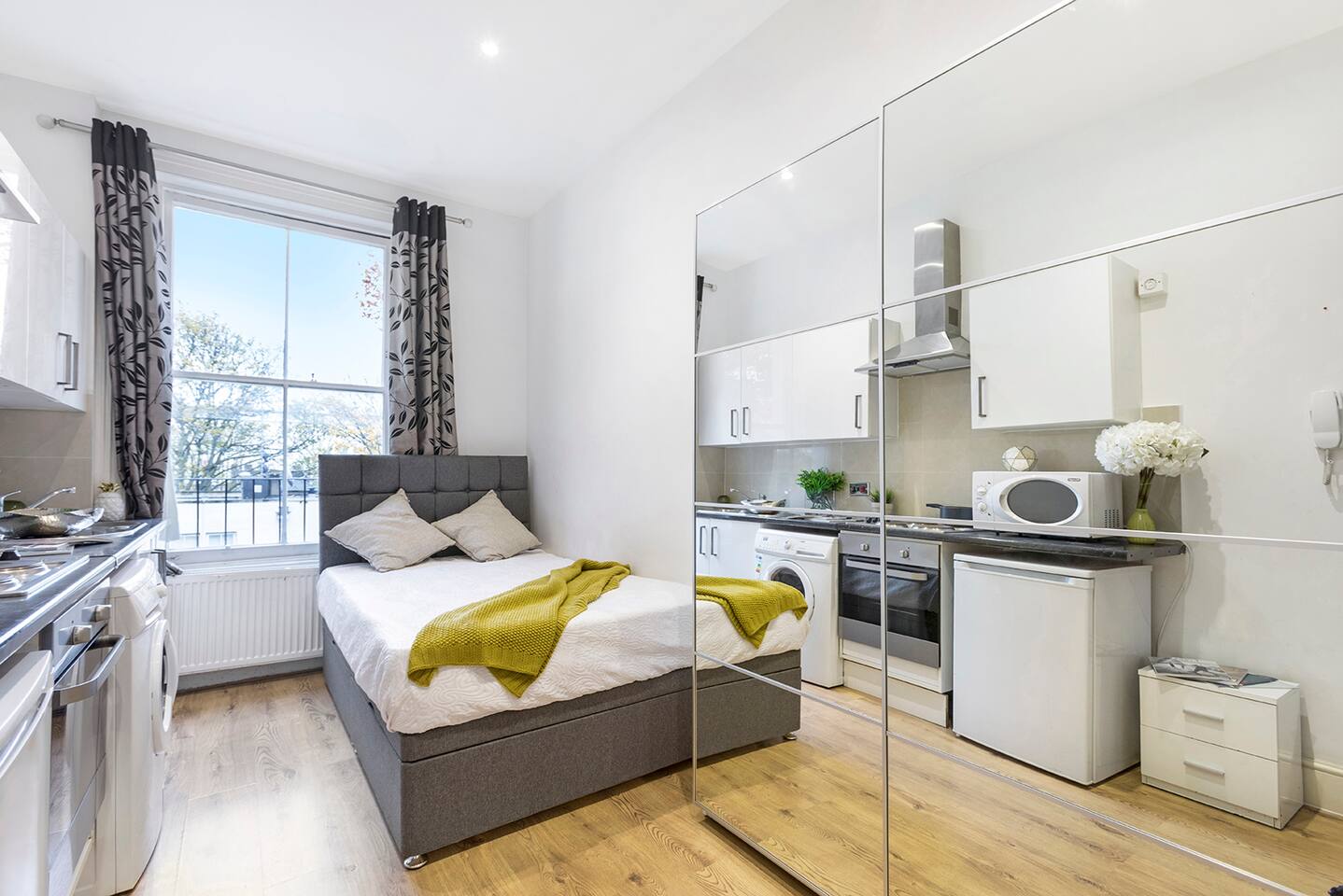 Step inside and discover a thoughtfully designed studio, making the most of its compact size to provide you with everything you need for a pleasant stay. The kitchenette is equipped with all the essentials, allowing you to prepare your own meals and savor the local ingredients found in nearby markets. Whether you're a culinary enthusiast or simply prefer the convenience of home-cooked meals, this kitchenette will cater to your needs. After a day of exploring the city, unwind in the plush double bed, ensuring a restful night's sleep. The room comes with ample wardrobes, offering plenty of storage space for your belongings and keeping your stay clutter-free. The private bathroom, though compact, provides all the necessary amenities to freshen up and revitalize. Take a hot shower and feel rejuvenated after a day of adventures in London. Please note that the studio is located on the 2nd floor (two above ground), and unfortunately, there is no elevator. However, you'll be rewarded with a charming and comfortable space that feels like a true home away from home. For added convenience, laundry facilities are available in the building, and they are free to use during your stay. No need to overpack or worry about finding a laundromat; take care of your laundry with ease. As for the location, you couldn't ask for a better base to explore London. Bayswater is renowned for its diversity, lively atmosphere, and an array of restaurants, cafes, and shops. Moreover, it's just a stone's throw away from Hyde Park, perfect for a morning jog, leisurely stroll, or a delightful picnic. Whether you're here for business or pleasure, our small studio in Bayswater offers a delightful retreat that combines comfort, convenience, and affordability. Book your stay with us today and make your London experience truly memorable!
