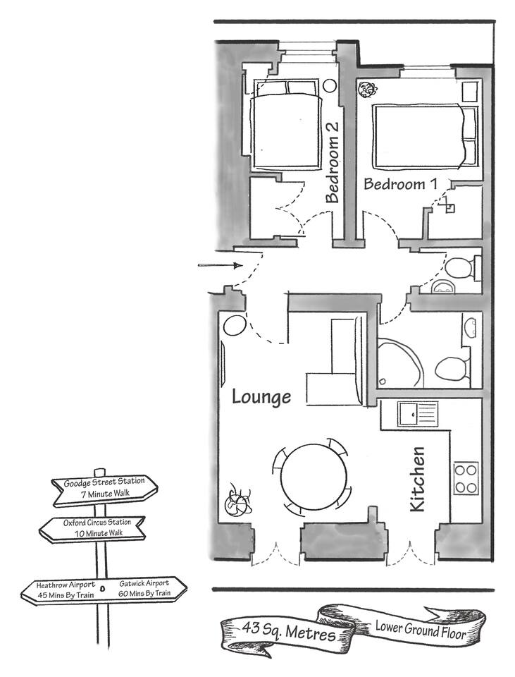 Closest stations: Goodge Street station (Northern Line): 5 minute walk Oxford Circus (Central, Bakerloo & Victoria Lines): 8 minute walk To Heathrow: Walk to Tottenham Court Road station (10 minutes), Elizabeth Line direct to Heathrow (40 minutes). To Gatwick: Walk to Oxford Circus station (7 minutes), Victoria Line to Victoria (7 minutes), Gatwick Express to Gatwick (55 minutes). Nearby buses: 55, 73, 98, 380, N8, N25, N55, N73, N98, N207
