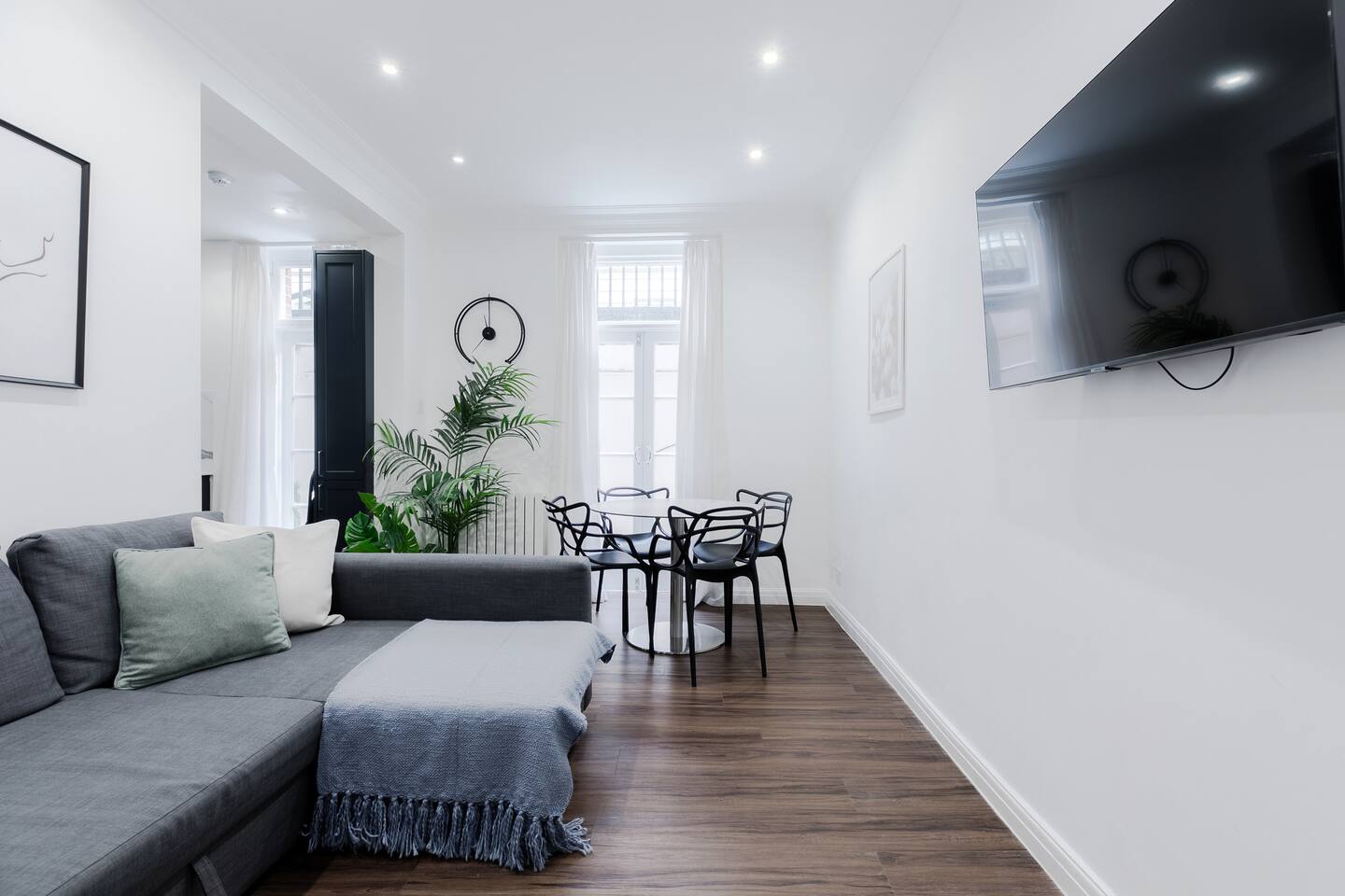 Welcome to our charming and cozy two-bedroom apartment in the heart of Fitzrovia, just moments away from the bustling Oxford Street. Whether you’re a shopaholic, a culture enthusiast, or simply looking for a comfortable getaway, this delightful flat is the ideal starting point for your London adventure. Living Area: Stylish and Comfortable Relax on the sofa bed, gather around the dining table, or unwind with the TV—all tastefully furnished for your comfort. Kitchen: Ready for Any Meal With modern amenities and a fully equipped space, you’ll find a fridge, freezer, cooker, and plenty of countertop space to whip up your favorite dishes. Bedrooms: A Restful Retreat Both bedrooms feature double beds with high-quality linens, ample storage, and soft bedding to ensure a superior night’s sleep. Bathroom: Refresh and Recharge Enjoy both bath and shower facilities, two separate toilets, and high-quality towels and toiletries for your convenience. Additional Features: Stay connected with free Wi-Fi, take advantage of the washer-dryer, and enjoy the ease of self check-in—all in a prime location