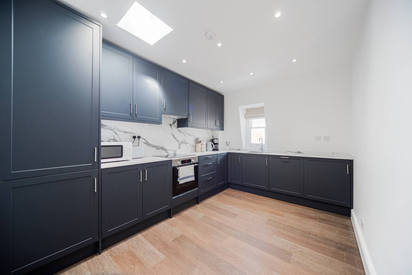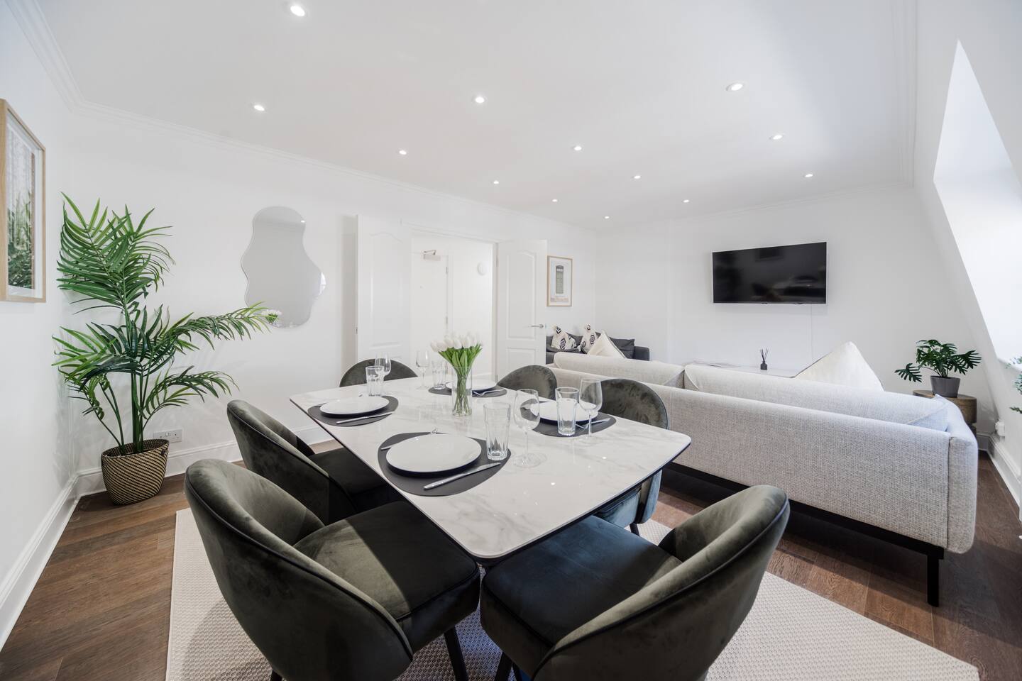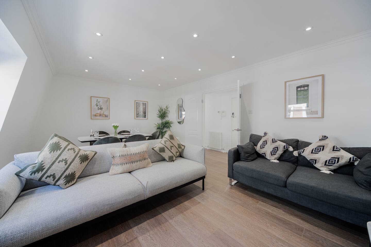 A beautiful, spacious three bedroom, two bathroom floor through apartment located on the top floor of a Georgian red brick building in the center of London. The Living room: Spacious and Luxurious Smart TV, ample comfortable seating including a large sofa, large dining space, modern decoration, spacious design. The bedrooms: A superior night sleep downtown Double beds with soft and lavish bedding, ample storage space, inviting ambiance for sleeping and relaxing, en-suite master bedroom The kitchen: An ideal space for cooking and hosting Fully fitted modern kitchen with a large fridge, dishwasher, washing machine, electric oven, gas stove top and a breakfast bar. The bathrooms: time to refresh and recharge Fully equipped bathroom spaces, one en-suite bathroom for the master bedroom, toiletries provided. The Building has a lift however it stops at at the landing between floors. There are 12 Step from the ground floor to the lift and from the left to the apartment.