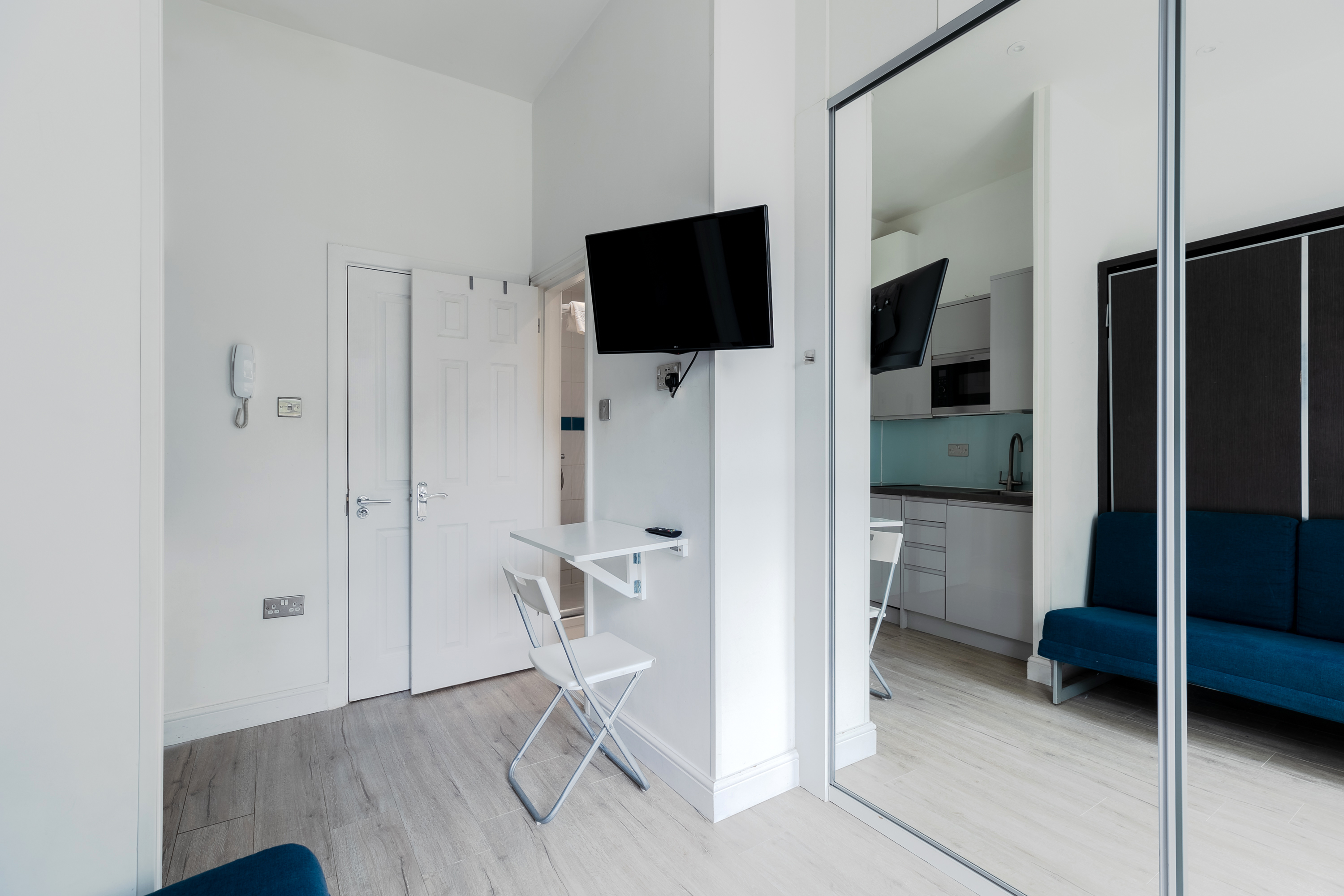 A modern and stylish , fully self contained Central London studio apartment with, a beautiful mirrored wardrobe, ample storage throughout, compact kitchen and private bathroom. Laundry facilities are located within the building and available for free.