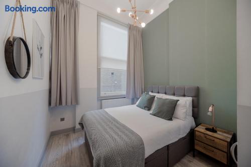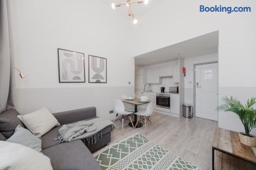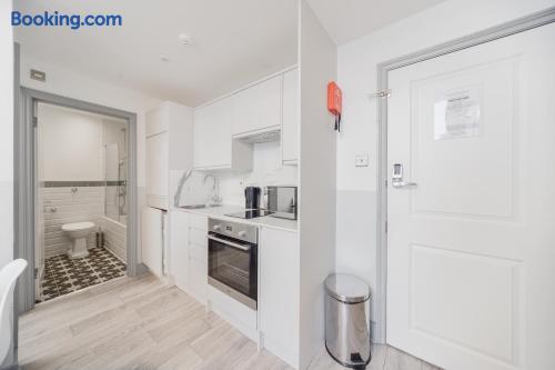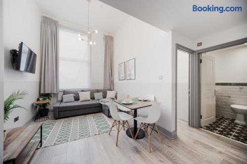 Experience a comfortable and stylish London stay in our charming 28-square-meter apartment. Large windows flood the space with natural light, creating a bright and inviting ambiance. The apartment is thoughtfully designed for comfort and convenience. **Living & Dining Area:** * Comfortable sofa that converts into a double bed for additional guests. * Wall-mounted flat-screen TV for entertainment. * Dining table with seating for four. * Dedicated workspace perfect for remote work or planning your day. **Kitchen:** * Sleek, open-plan design with modern stainless steel appliances. * Fully equipped with an oven, microwave, hob, and fridge-freezer. * Nespresso coffee maker for your morning coffee. * Convenient in-unit washer and dryer. **Bedroom:** * Cozy double bed (135 x 190cm) with fresh, high-quality linens. * Spacious wardrobe to store your belongings. * Bedside lamps for relaxing evening reading. **Bathroom:** * Clean and modern design. * Full bathtub and shower combination. * Plush towels and quality toiletries are provided for your stay.