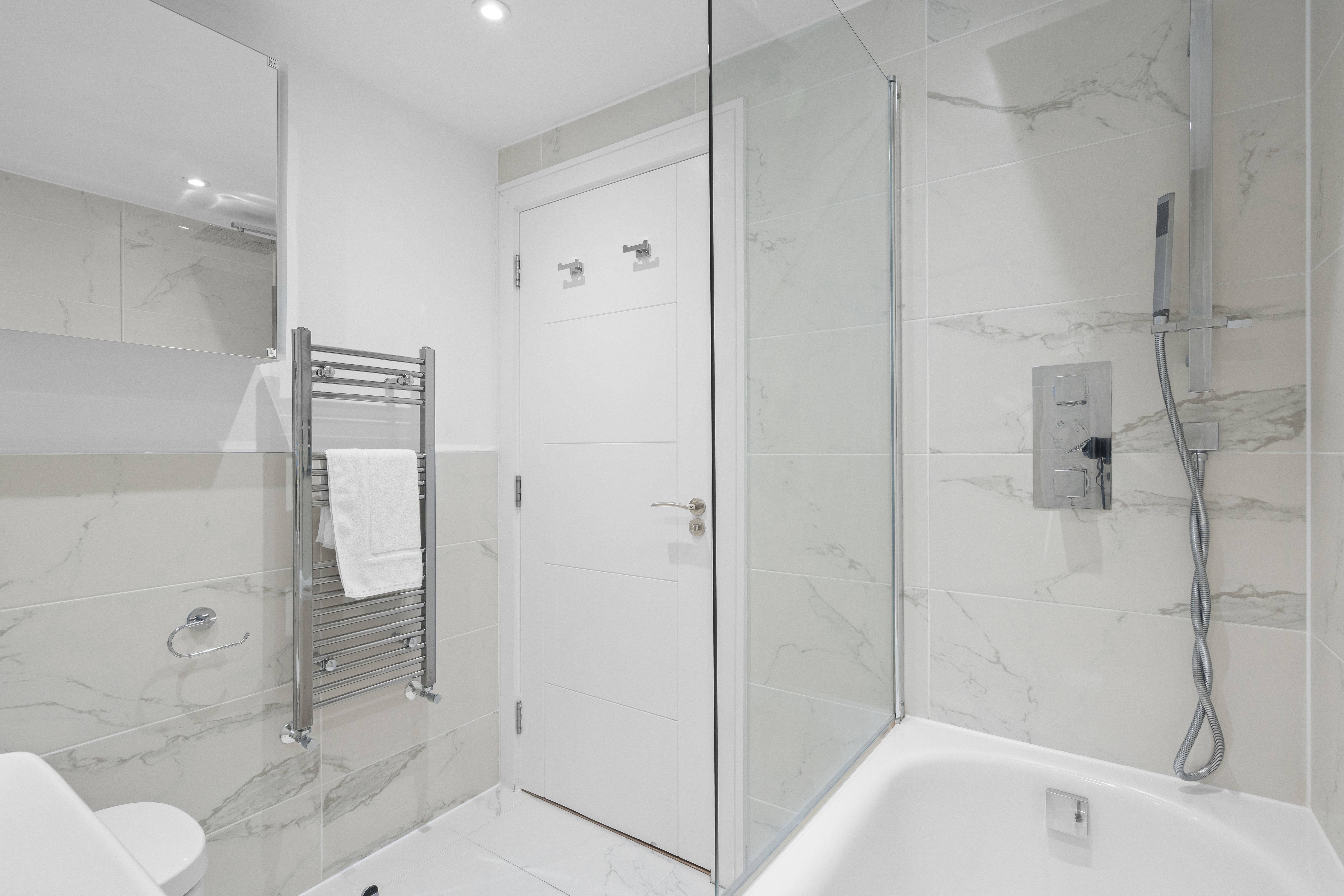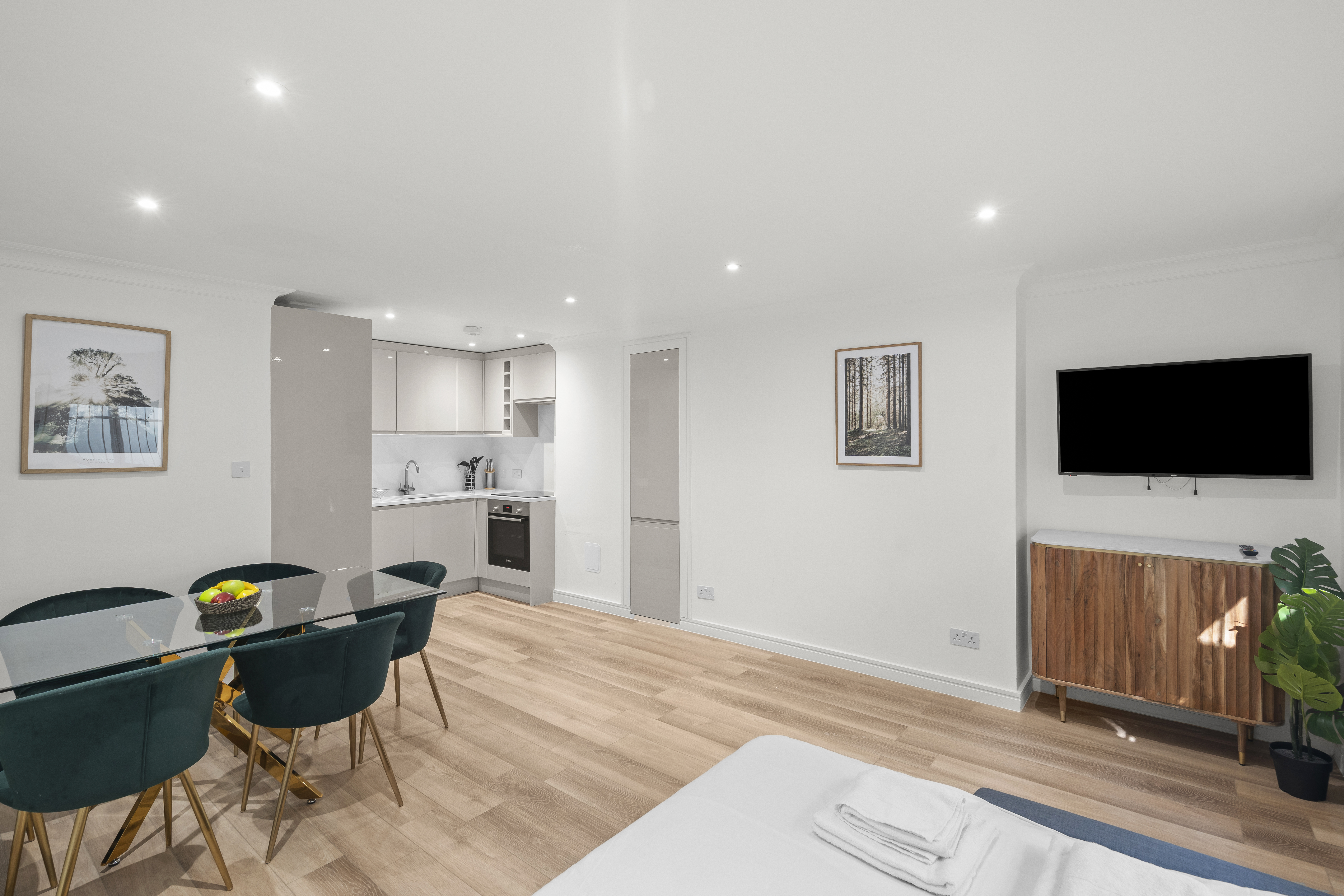 Spacious Bedrooms This apartment boasts two generous double bedrooms, each designed with your comfort in mind. Sink into luxurious bedding and enjoy ample storage for a clutter-free, restful retreat. Modern Bathrooms Start your day effortlessly with two sleek, contemporary bathrooms. Outfitted with fresh towels, essential toiletries, and stylish fixtures, they ensure a refreshing and hassle-free experience. Inviting Living Area The cozy living room is perfect for relaxation, featuring a comfortable double sofa bed for extra guests. Whether you’re unwinding with a movie or mapping out your London adventures, this space is ideal for downtime. Fully Equipped Kitchen Cooking is a breeze in the modern kitchen, complete with state-of-the-art appliances, cookware, and utensils. Savor your meals in the dining area or at the charming breakfast nook—perfect for enjoying your homemade creations. Essential Amenities Washer/Dryer: Travel light and keep your wardrobe fresh. Wi-Fi: Enjoy seamless high-speed internet throughout your stay. TV: Relax with your favorite shows or movies after a day of exploring.
