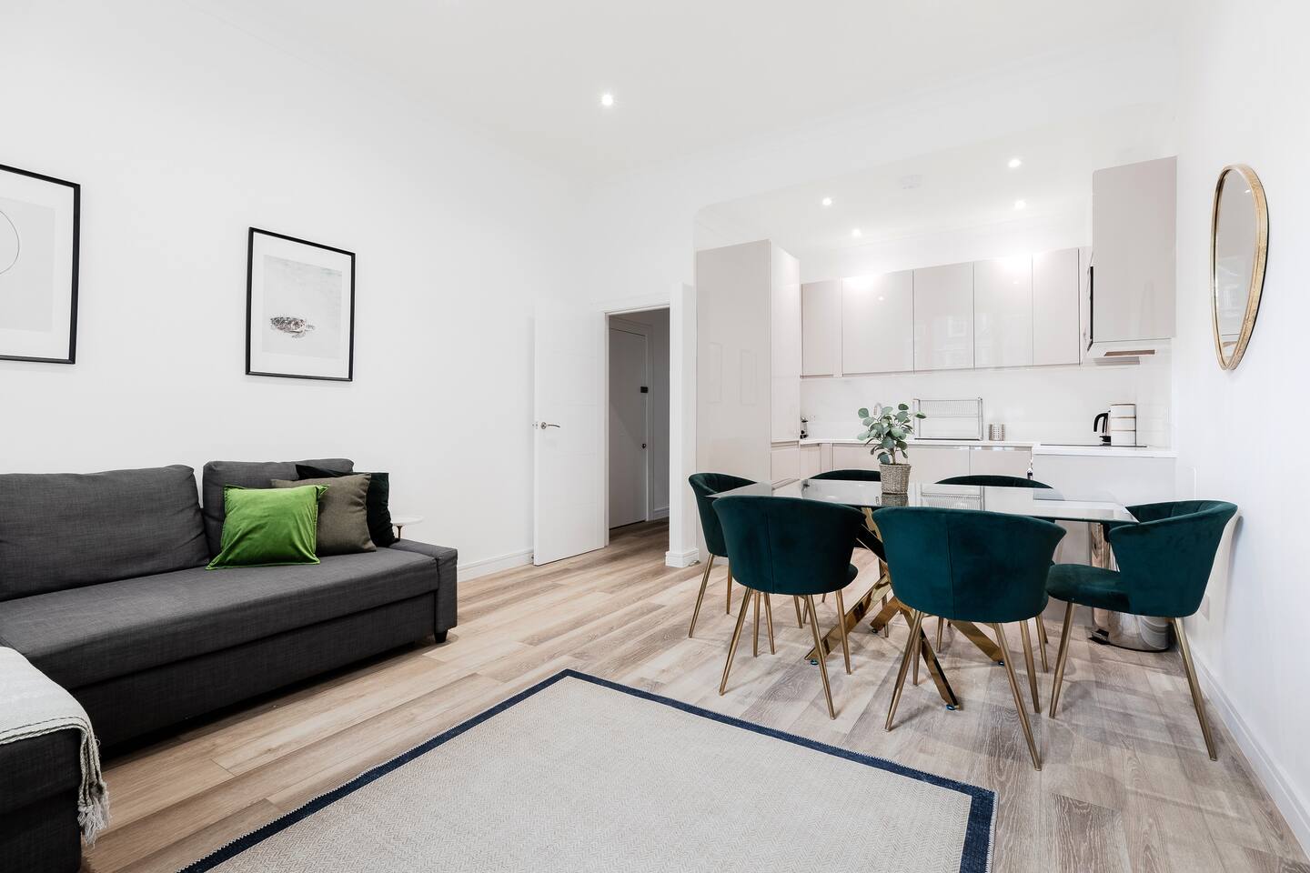 Welcome to your sophisticated home away from home in one of London’s most sought-after neighborhoods. This bright and airy ground-floor apartment combines modern luxury with all the comforts of home, designed for business travelers, families, or groups of friends. Relax in the chic, contemporary lounge, featuring premium seating and a double sofa bed for additional guests. The gourmet kitchen is fully equipped with modern appliances and high-gloss cabinets, ideal for preparing everything from quick breakfasts to group dinners. * **Master Bedroom**: Unwind in a plush king-size bed. * **Second Bedroom**: A cozy double bed ensures a restful night's sleep. * **Living Area**: Includes a comfortable double sofa bed. * **Bathrooms**: Indulge in a sleek, well-appointed bathroom with marble-style tiling, plus a separate WC for added convenience and privacy.